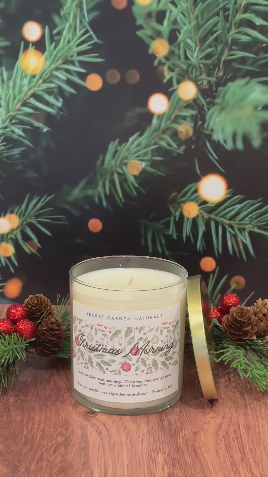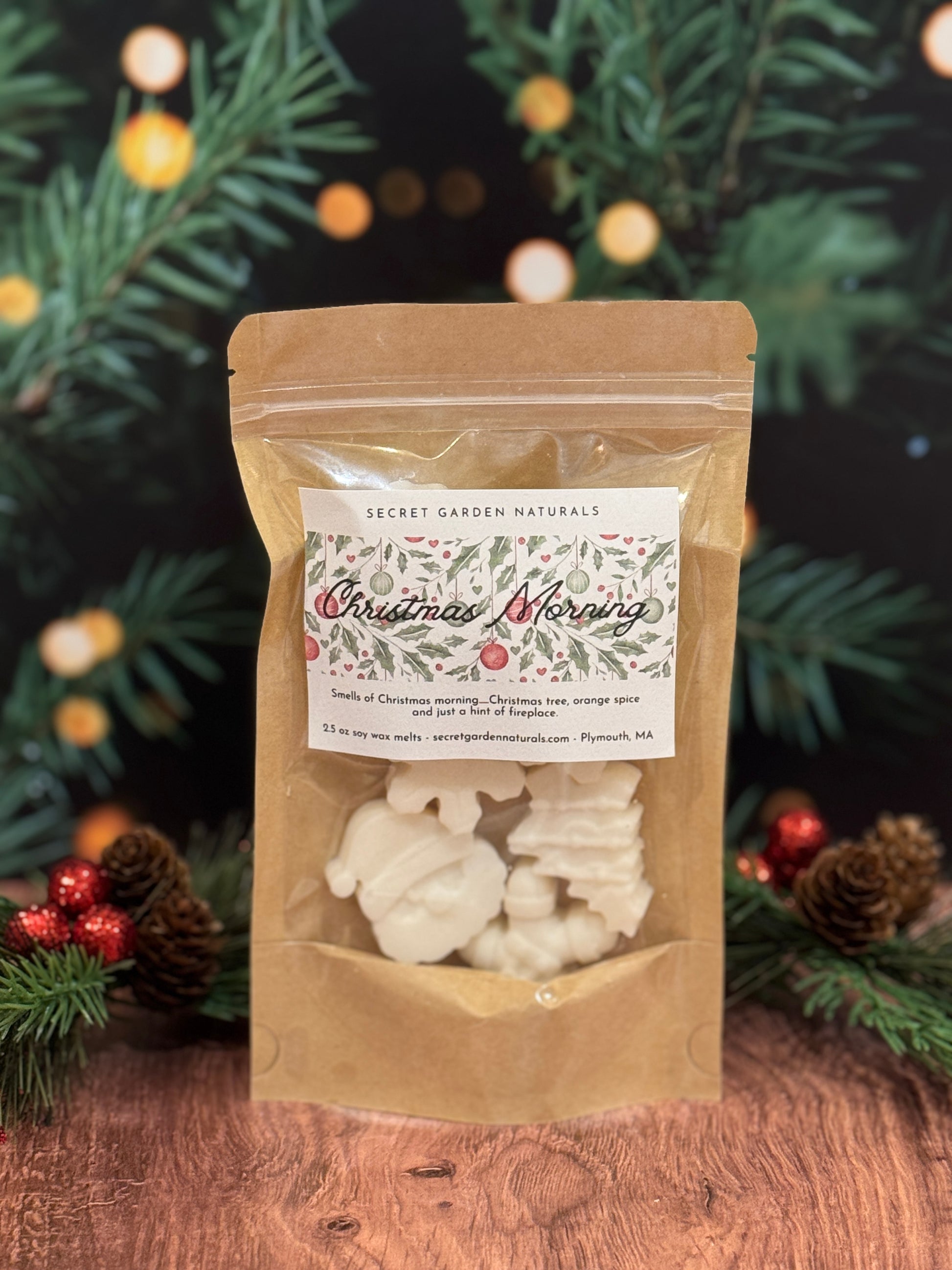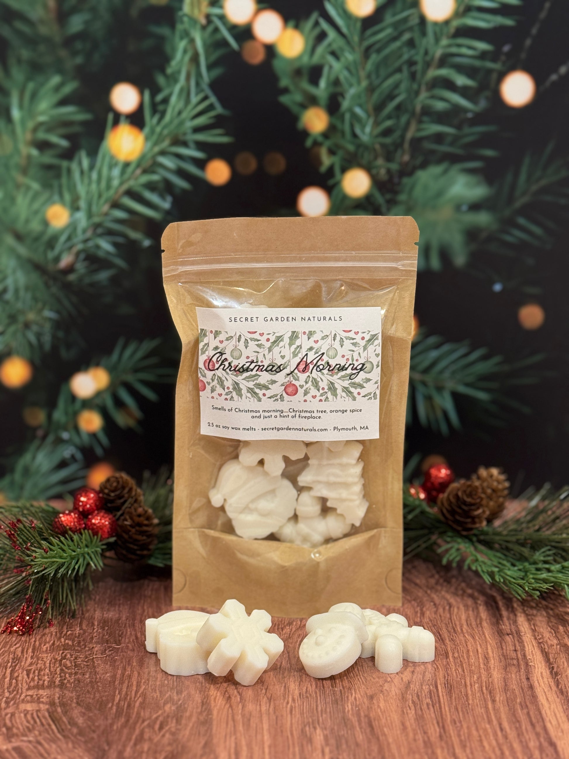 Smells of Christmas morning....Christmas tree, orange spice and just a hint of fireplace!! Products are thoughtfully made using soy wax and fragrance oils that are phthalate and carcinogen free for a clean and fragrant burn!