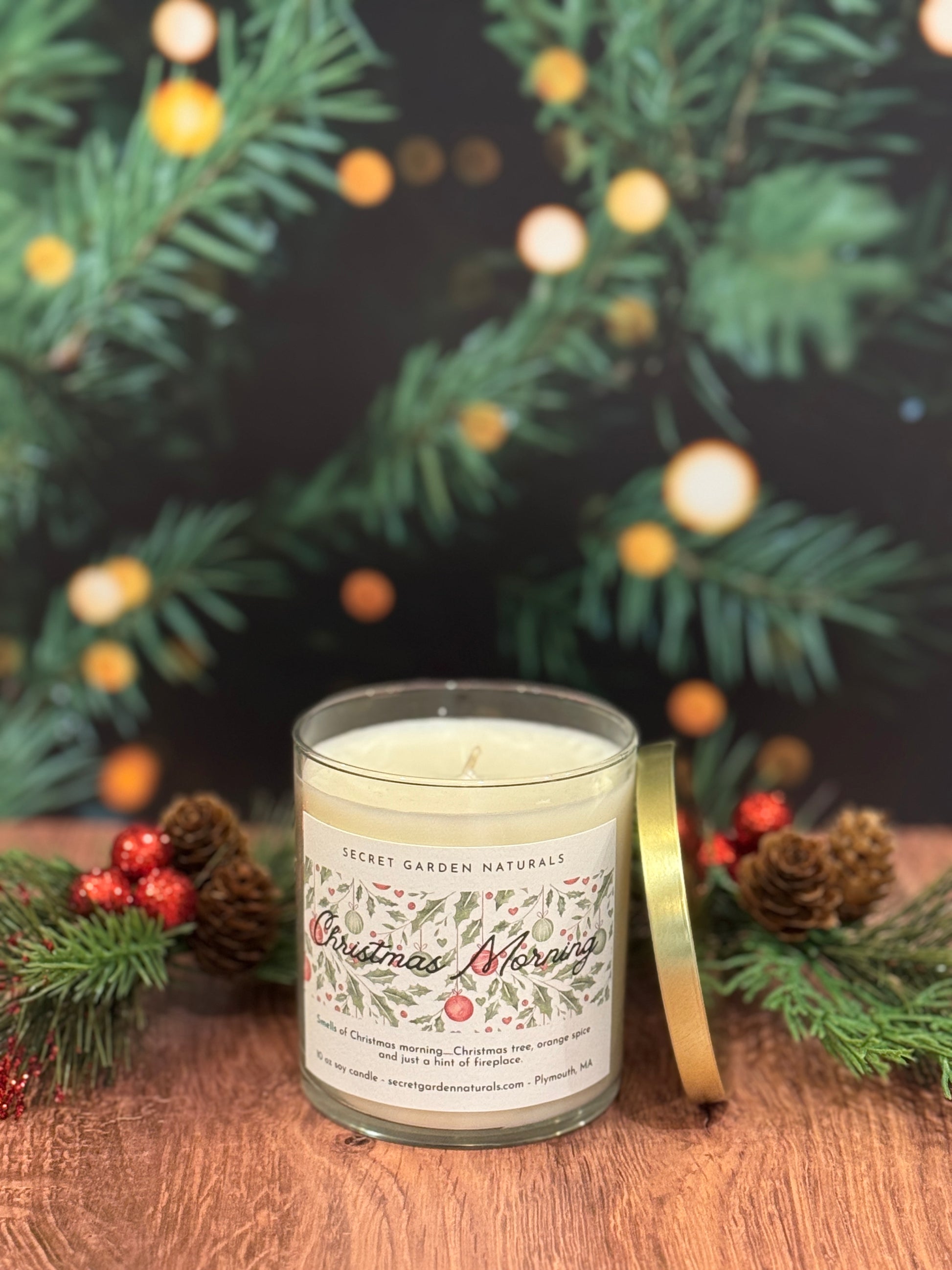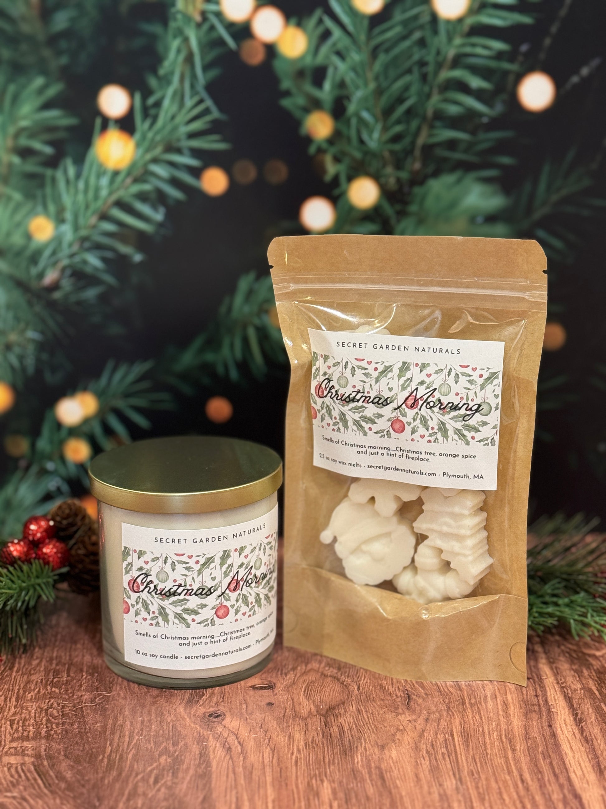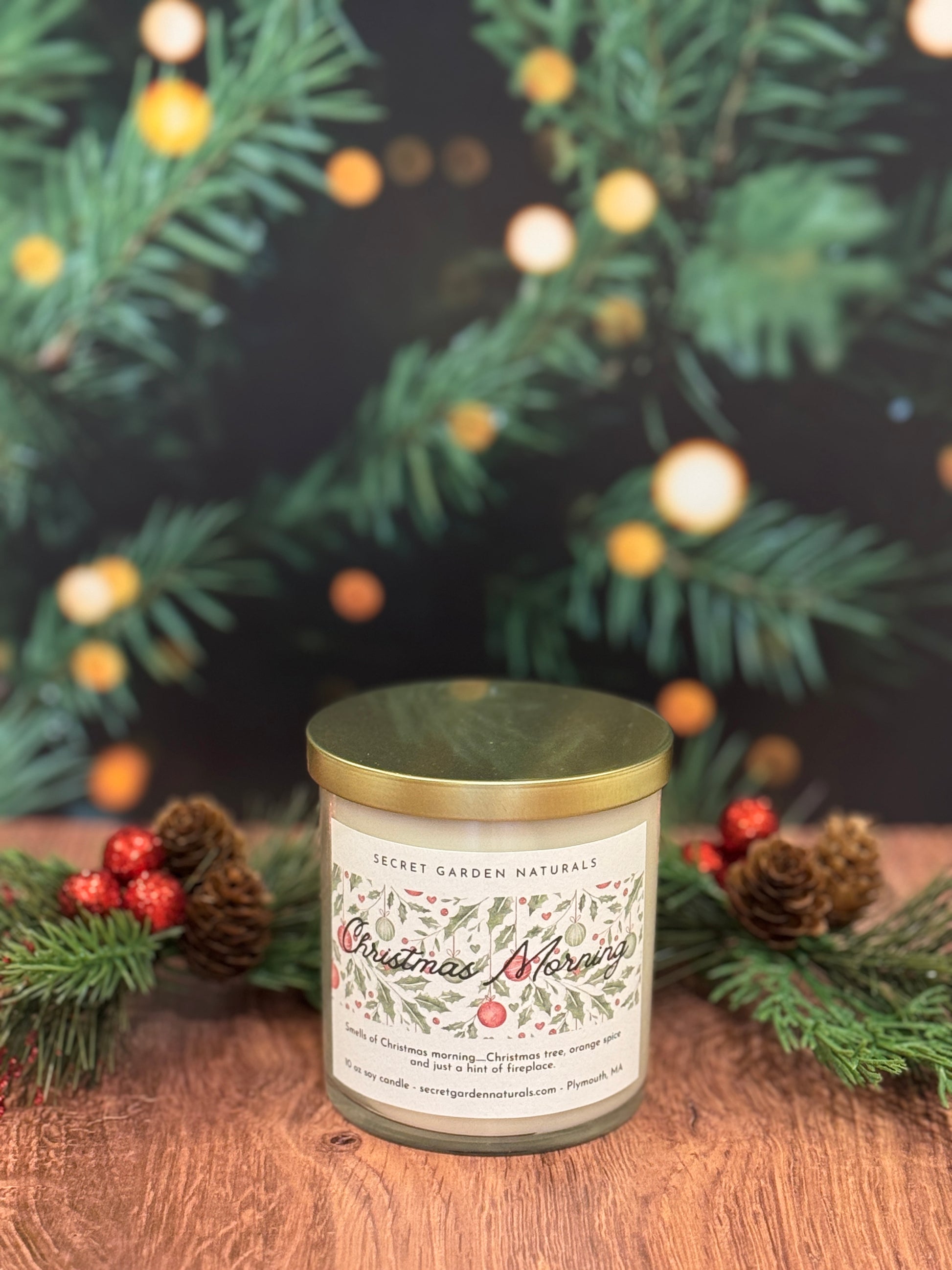 Smells of Christmas morning....Christmas tree, orange spice and just a hint of fireplace!! Products are thoughtfully made using soy wax and fragrance oils that are phthalate and carcinogen free for a clean and fragrant burn!