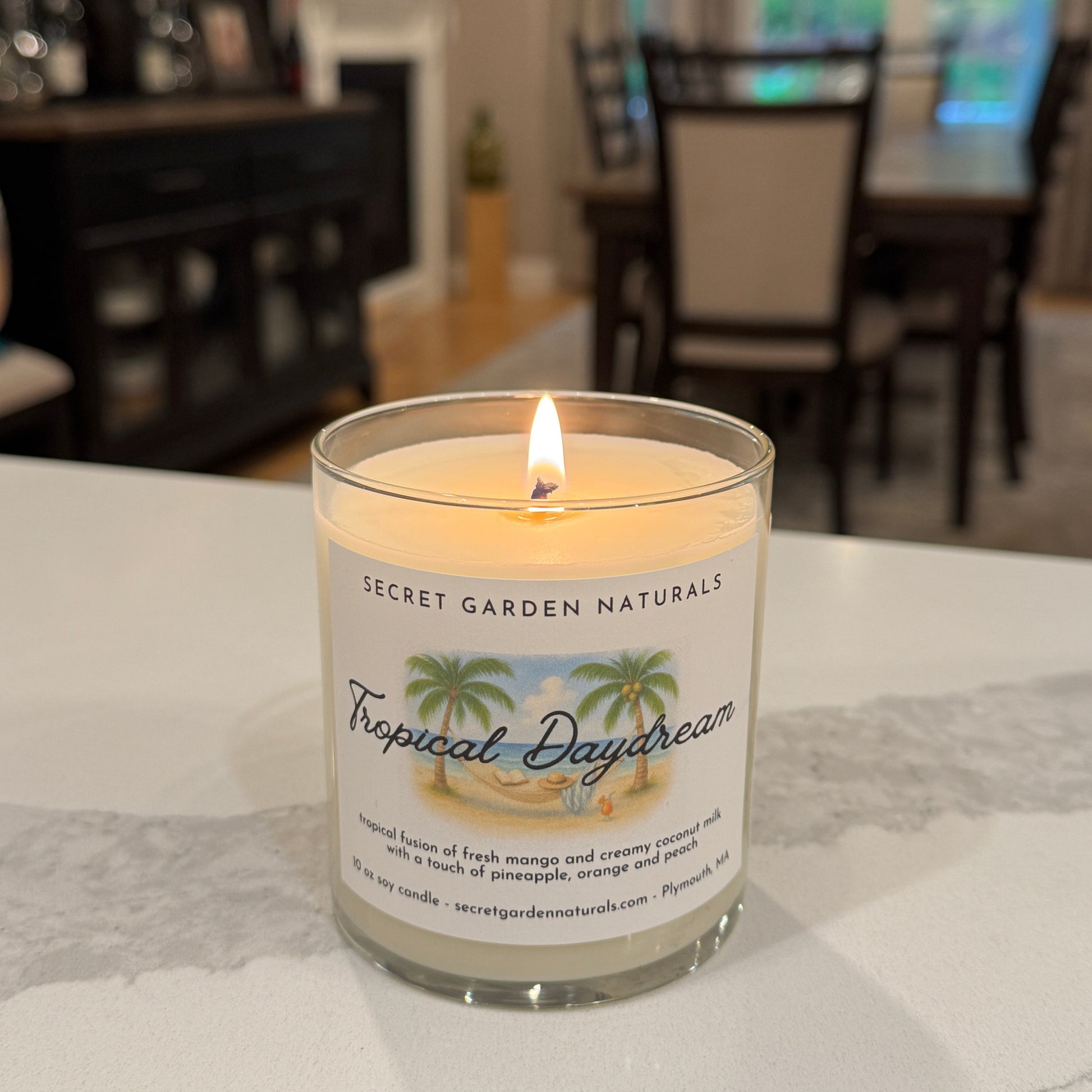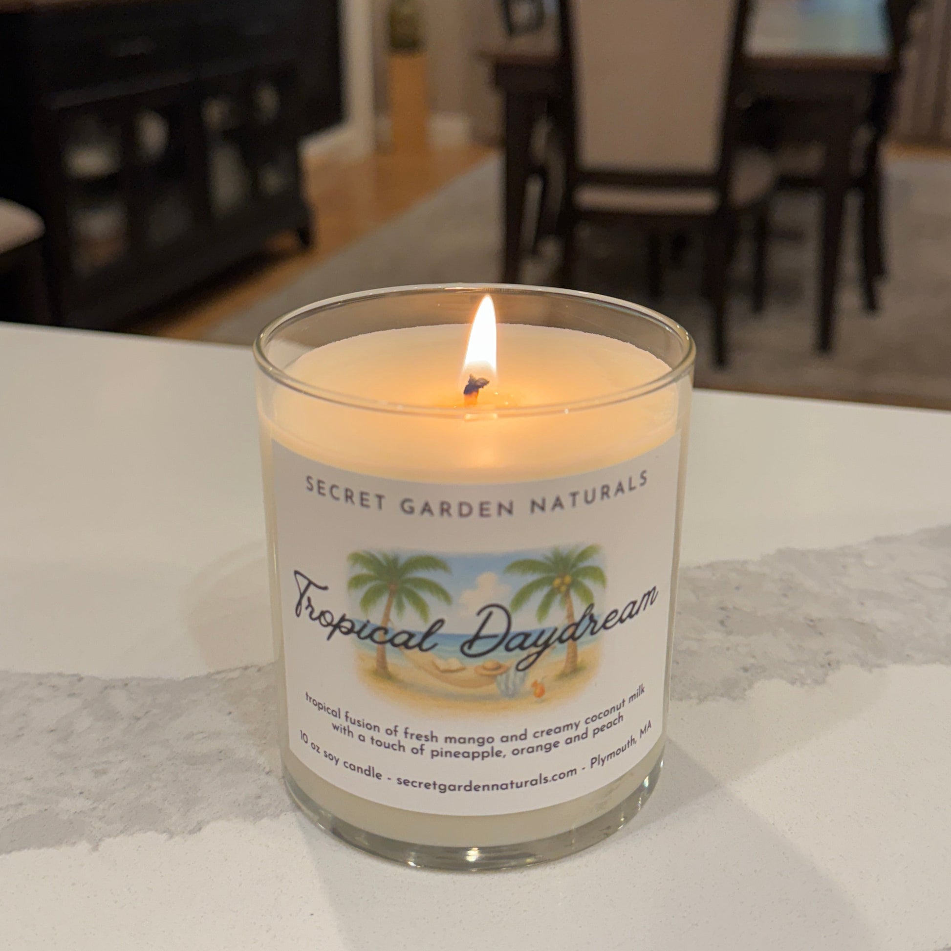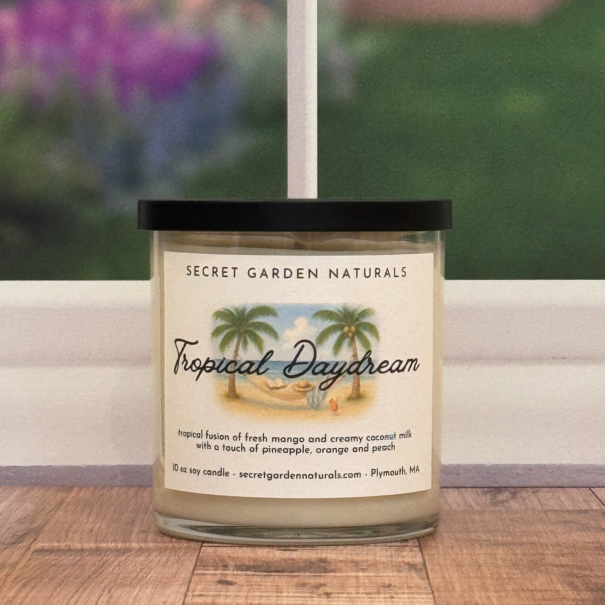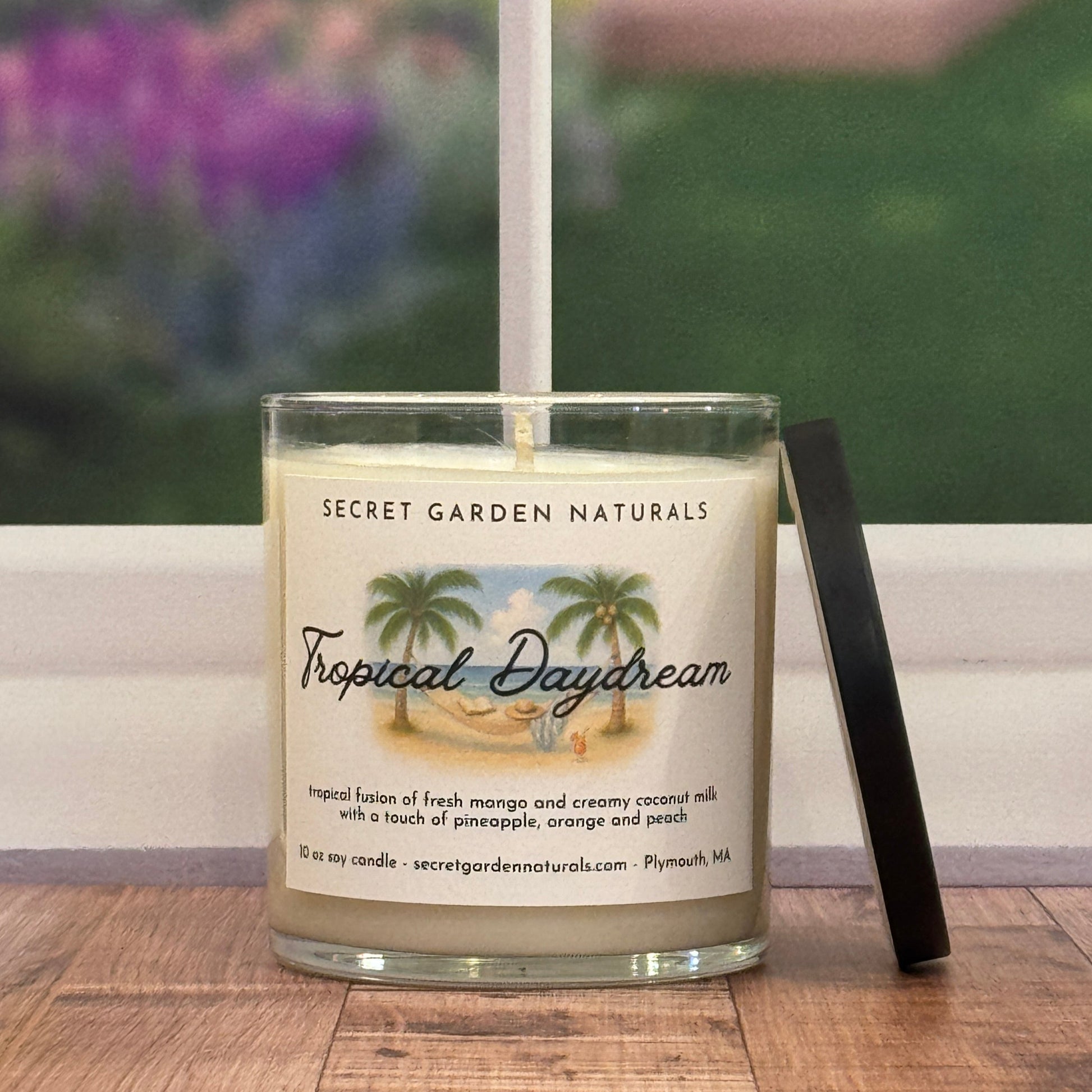 This candle sweeps you away to a place where time slows and the breeze smells like vacation. Juicy mango takes center stage, mingling with sweet pineapple and a splash of orange for a burst of tropical brightness. Hints of ripe peach soften the edges, while creamy coconut milk and a touch of sugar linger like warm sand on the skin. It's lush, golden, and endlessly daydream worthy.
